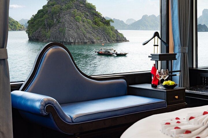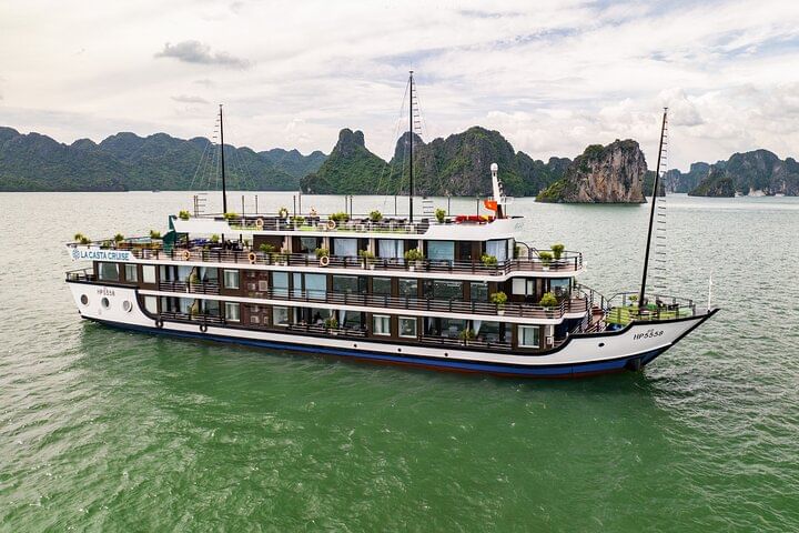 On the La Casta tour, you can look forward to a ton of exciting activities like kayaking, tanning, squid fishing, afternoon tea, cooking classes, etc. Come sail with us as we explore the breathtaking beauty of Tonkin Bay, which includes Halong Bay, Lan Ha Bay, and the neighboring locations.Only 22 opulent accommodations, the smallest of which is 28 square meters, will be available on the trip, which promises to be the greatest experience you can have in the harbor. All of La Casta Cruise's accommodations have a private balcony with a panoramic view of the bay and the ocean thanks to the building's construction. There are 4 available choices of room type, namely, Junior Suite, Senior Suite, Family Suite, VIP Suite (Honeymoon Suite)